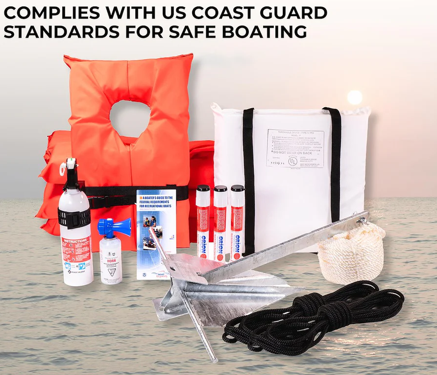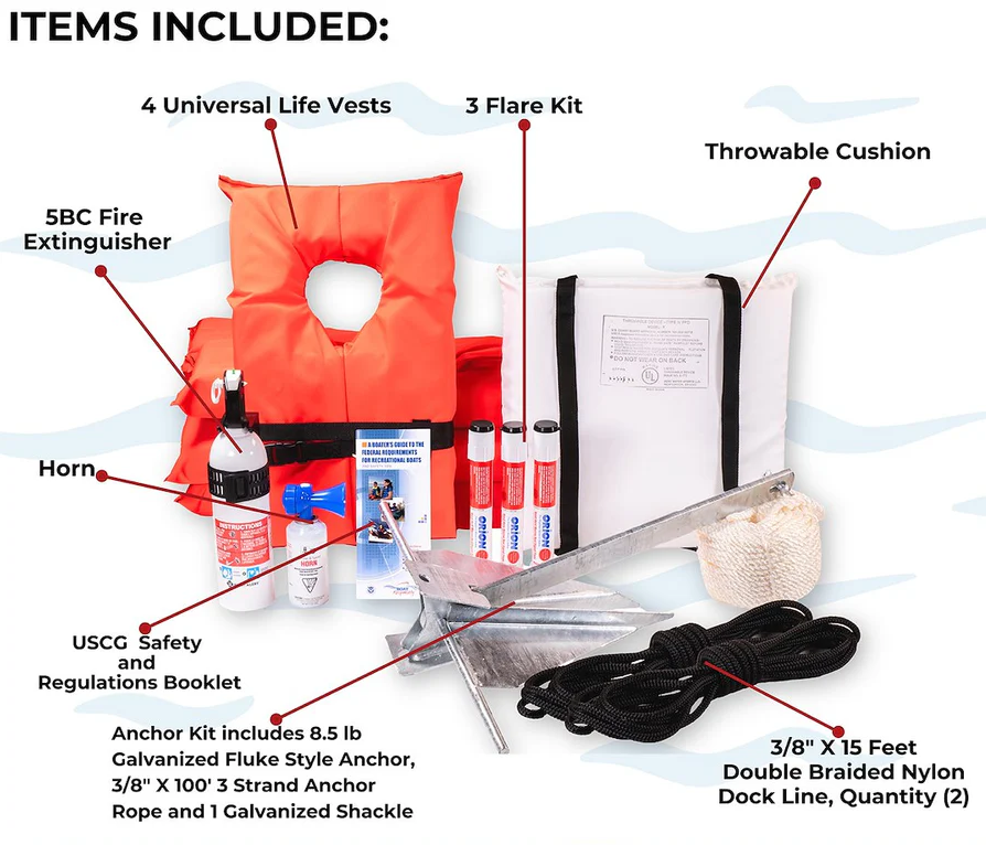 We offers high quality products at an exceptional value for all your boating needs. This safety kit is designed for boats up to 19 feet length and supplies the basic federal required safety gear needed to get you out on the water. Products included are four Universal Life Vests, Throwable Cushion, 3-Flare Kit, Horn, 5BC Fire Extinguisher, Anchor kit includes 8.5 pound Galvanized Fluke Style Anchor, 3/8 inch x 100 feet 3-Strand Anchor Rope and Galvanized Shackle, two 3/8 inch x 15 feet Double Braided Nylon Dock line, USCG Safety and Regulations Booklet.
